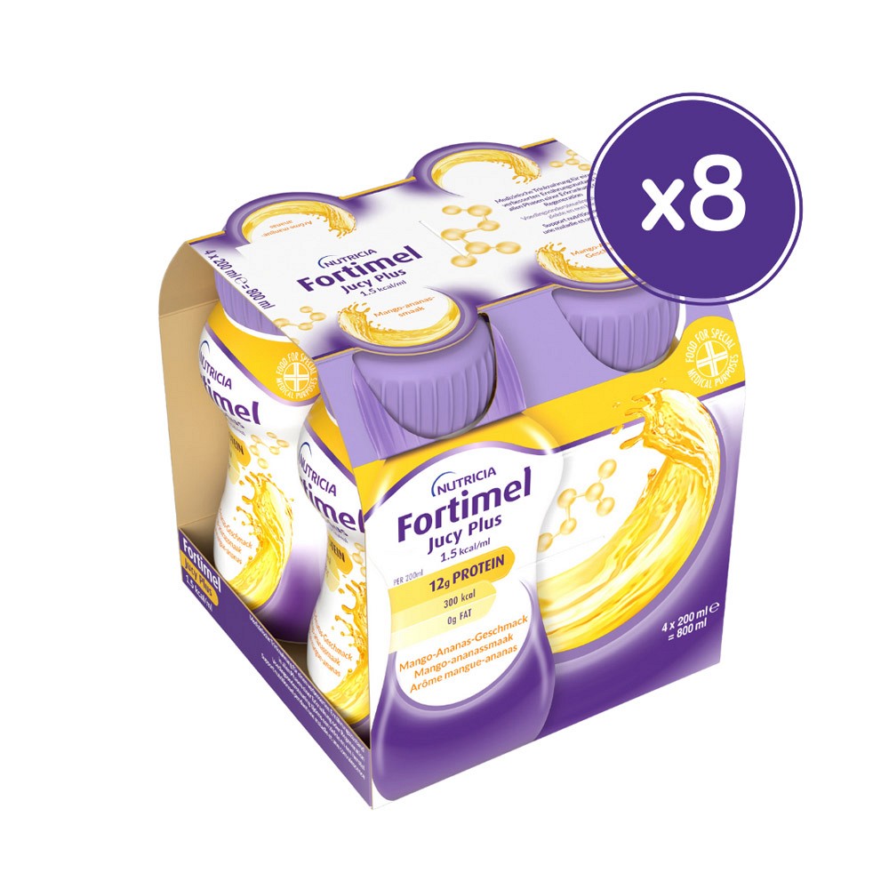 32 x 200 ml Fortimel® Jucy Plus Mango-AnanasErhältlich in den zwei weiteren erfrischend leckeren Geschmacksrichtungen Birne-Holunder und Himbeere mit frischer Note.