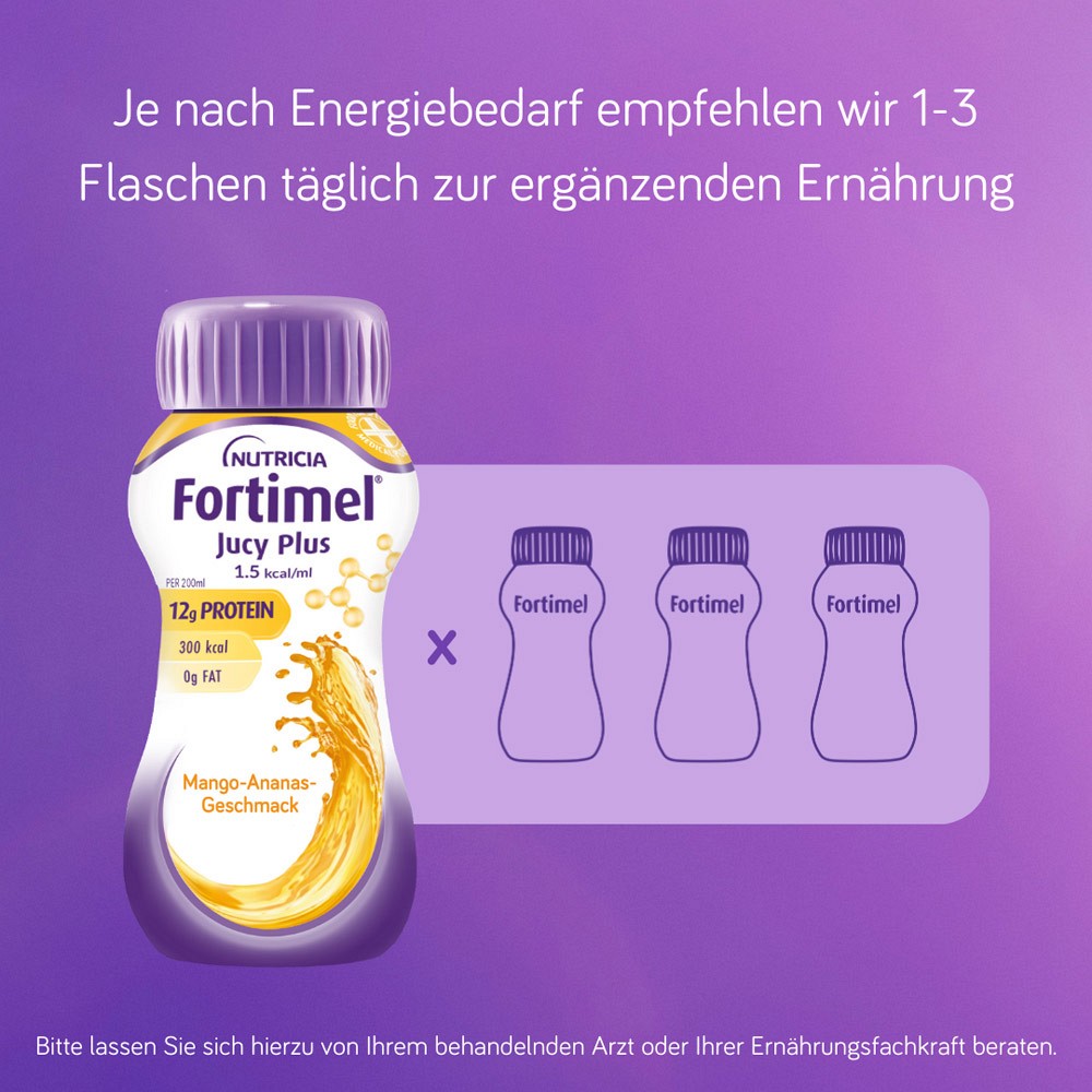 Zur ergänzenden Ernährung: 1-3 Flaschen/TagFortimel®️ Trinknahrungen sind Lebensmittel für besondere medizinische Zwecke (bilanzierte Diät). Zum Diätmanagement bei krankheitsbedingter Mangelernährung. Nicht zur ausschließlichen Ernährung geeignet. Für Erwachsene bestimmt. Nur unter ärztlicher Aufsicht verwenden.