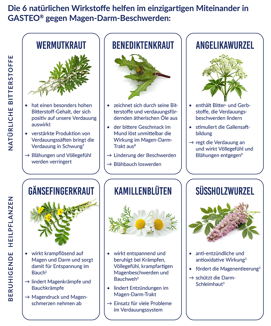 Dies verstärkt den vorhandenen Magensäuremangel und somit auch die Beschwerden. GASTEO ist ein traditionelles Arzneimittel, angewendet bei Erwachsenen zur Linderung von leichten Verdauungsbeschwerden (z.B. Völlegefühl, Blähungen), sowie leichten krampfartigen Beschwerden im Magen-Darm-Trakt. GASTEO wirkt nicht als Säurebinder oder -blocker.