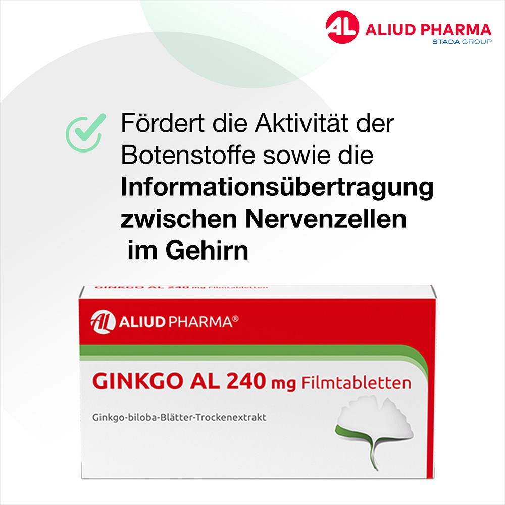 training erzielen eine positive Wirkung, zusätzlich lassen sich Konzentration und Merkfähigkeit durch geeignete Arzneimittel unterstützen. GINKGO AL enthält als Wirkstoff einen Extrakt aus Ginkgo Biloba Blättern, der Nervenzellen vor schädlichen Einflüssen schützen und die Funktion von Botenstoffen im Gehirn, die Gedächtnis und Lernen beeinflussen, stabilisieren kann.*