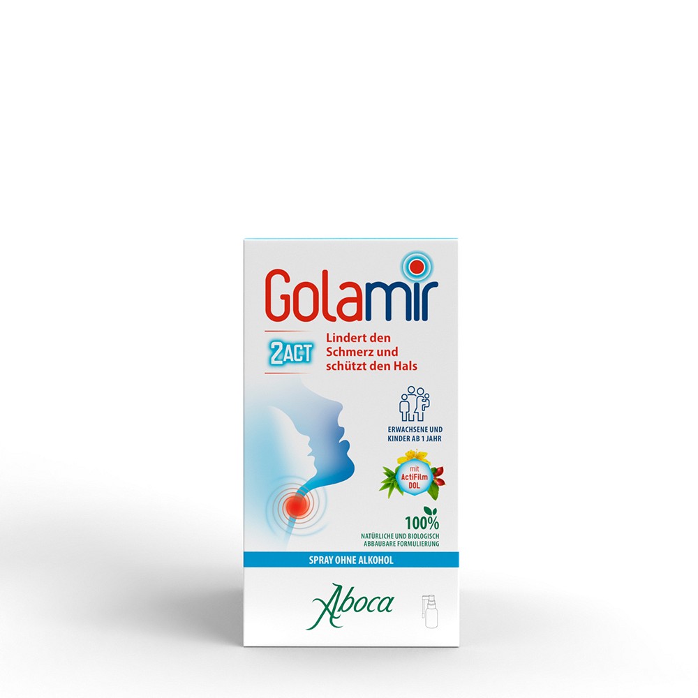 Medizinprodukt - 30 ml Spray in Flasche mit FeinzerstäuberGolamir 2Act Spray ohne Alkohol eignet sich bei Halsschmerzen zur Behandlung von irritativen und entzündlichen Zuständen des Mund- und Rachenraums, die von Viren, Bakterien, Allergenen oder dem Kontakt mit externen Reizstoffen (Rauch, Smog, Staub) verursacht sein können.