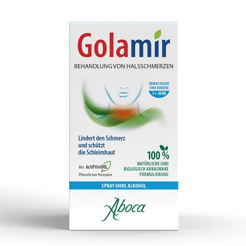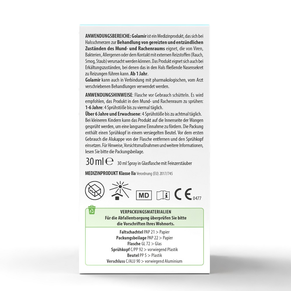 Geeignet bei Halsschmerzen, die von externen Reizstoffen (Viren, Bakterien, Allergenen, Rauch, Smog, Staub) verursacht sein können. Das Produkt eignet sich auch bei Erkältungszuständen, bei denen die in den Hals fließende Nasensekretion zu Reizungen führen kann. Geeignet für Erwachsene und Kinder ab 6 Jahren.Golamir kann aufgrund seines Wirkungsmechanismus auch in Verbindung mit pharmakologischen, vom Arzt verschriebenen Behandlungen verwendet werden.