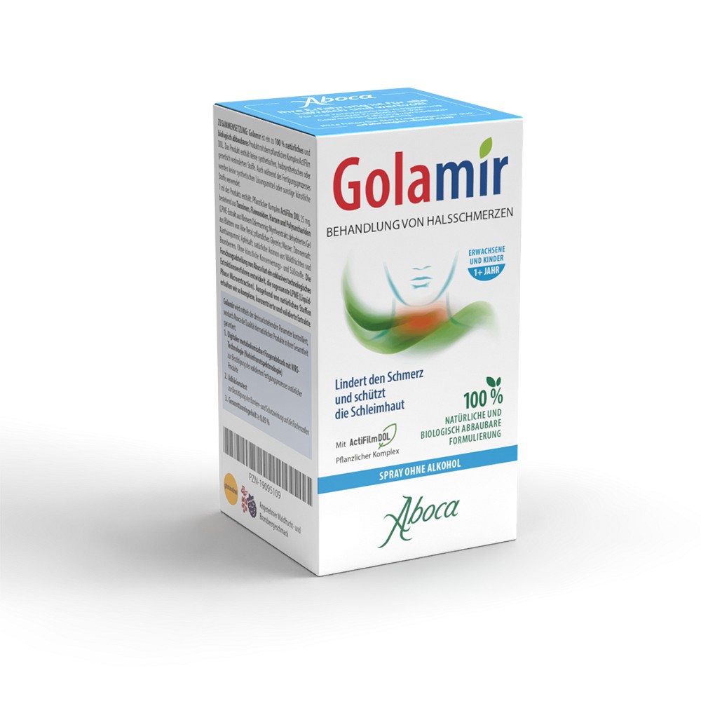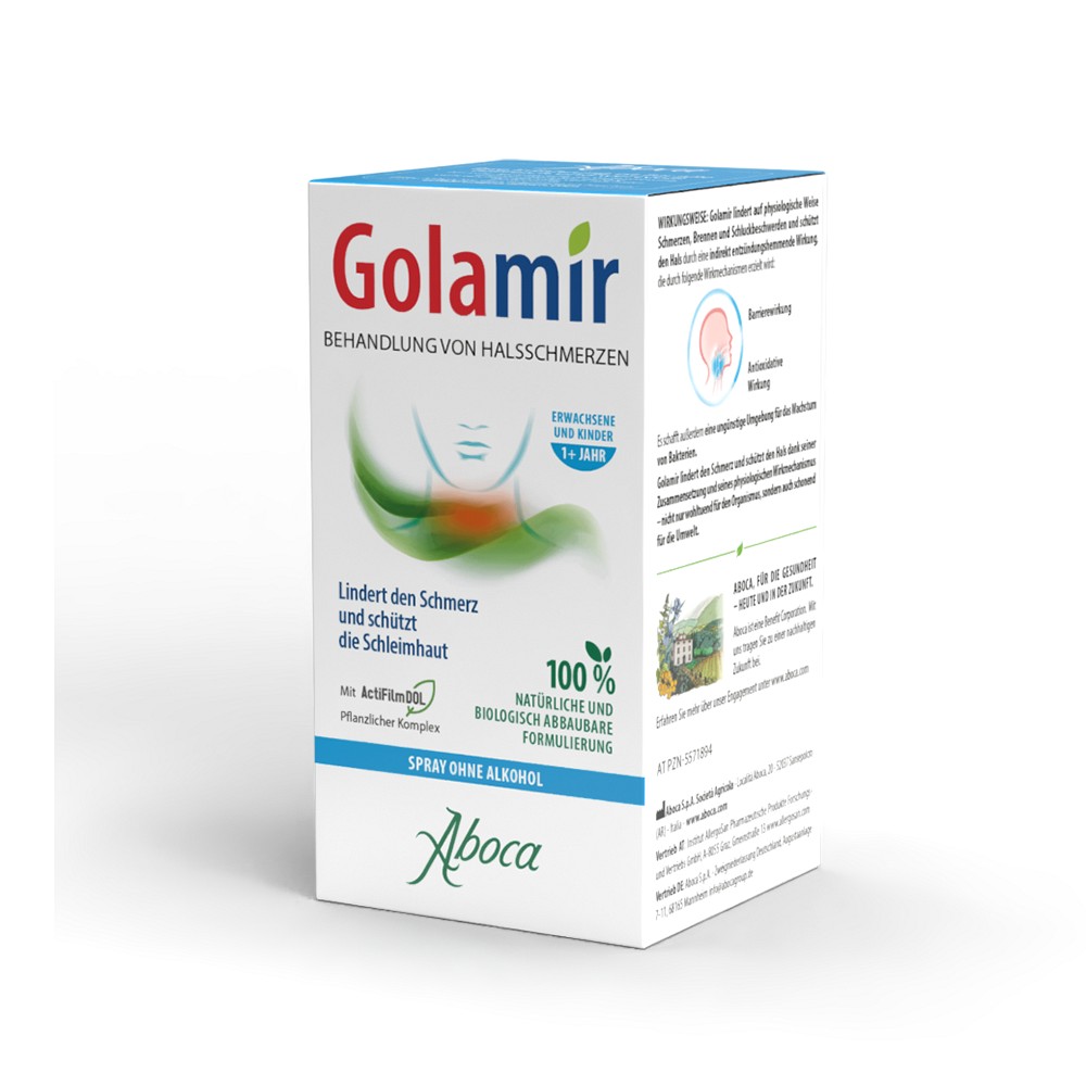 Golamir wirkt dank des pflanzlichen Molekülkomplexes ActiFilm DOL gegen Schmerzen, Brennen und Schluckbeschwerden, indem die Schleimhaut vor den Faktoren geschützt wird, die die Reizung auslösen. ActiFilm DOL, bestehend aus Tanninen, Harzen, Polysacchariden und Flavonoiden, bildet einen Film mit Barriereeffekt und zweifacher Wirkung:- er schützt die Oberfläche der Schleimhaut;