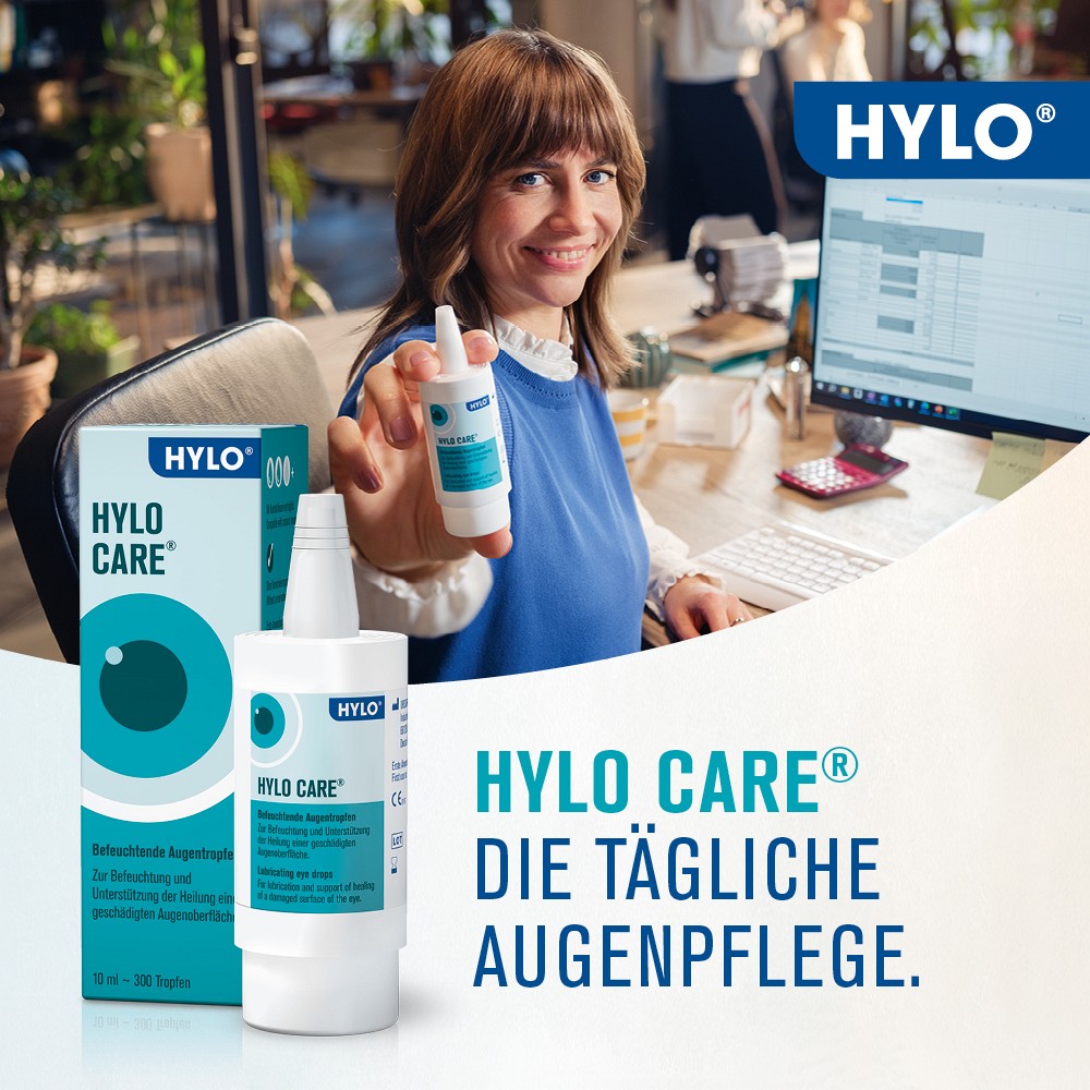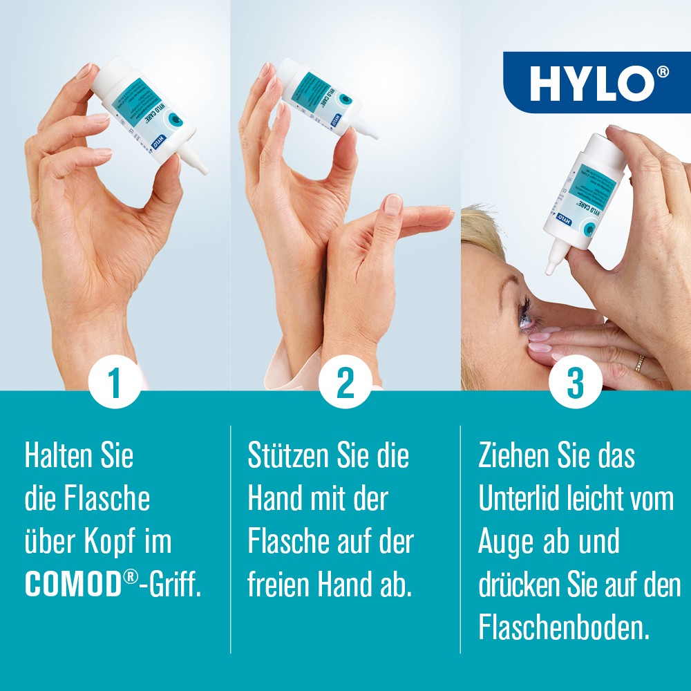 HYLO CARE® gibt jeden Tag ein gutes Augengefühl. Mit der Kombination aus hochwertiger Hyaluronsäure und Dexpanthenol eignen sich die befeuchtenden Augentropfen sehr gut für die tägliche Pflege gestresster Augen und schützen langanhaltend vor dem Austrocknen durch Heizungsluft und Umwelteinflüsse, Bildschirmarbeit oder dem Tragen von Kontaktlinsen. Dank des patentierten COMOD® Systems lassen sich die Augentropfen leicht und exakt dosieren: Pro Pumpstoß wird nur 1 Tropfen abgegeben.