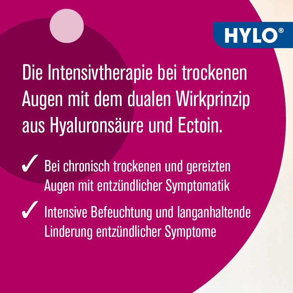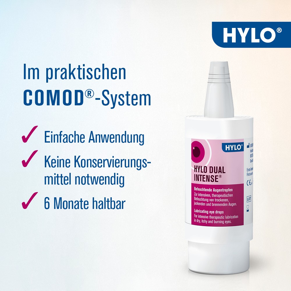 HYLO DUAL INTENSE® spendet chronisch trockenen und gereizten Augen mit entzündlichen Symptomen nachhaltige Feuchtigkeit. Die Kombination aus hochkonzentrierter Hyaluronsäure und Ectoin stabilisiert den Tränenfilm und schützt das Auge langanhaltend vor Reizungen und erneuter Austrocknung. Anhaltende, stärkere und sogar chronische Beschwerden werden dadurch effektiv gelindert.Wie alle HYLO®-Produkte sind auch die HYLO DUAL INTENSE® Augentropfen frei von Konservierungsmitteln und Phosphaten. Das patentierte COMOD® System garantiert eine hohe Ergiebigkeit (mind. 300 Tropfen pro Flasche) und lange Haltbarkeit von 6 Monaten.