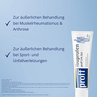 Anwendungsgebiete: Zur alleinigen oder unterstützenden äußerlichen Behandlung bei Schwellungen bzw. Entzündung der gelenknahen Weichteile (z. B. Schleimbeutel, Sehnen, Sehnenscheiden, Bänder und Gelenkkapsel), Sport- und Unfallverletzungen wie Prellungen, Verstauchungen, Zerrungen. Ibuprofen proff® 5 % Gel wird bei Erwachsenen und Jugendlichen ab 14 Jahren angewendet.