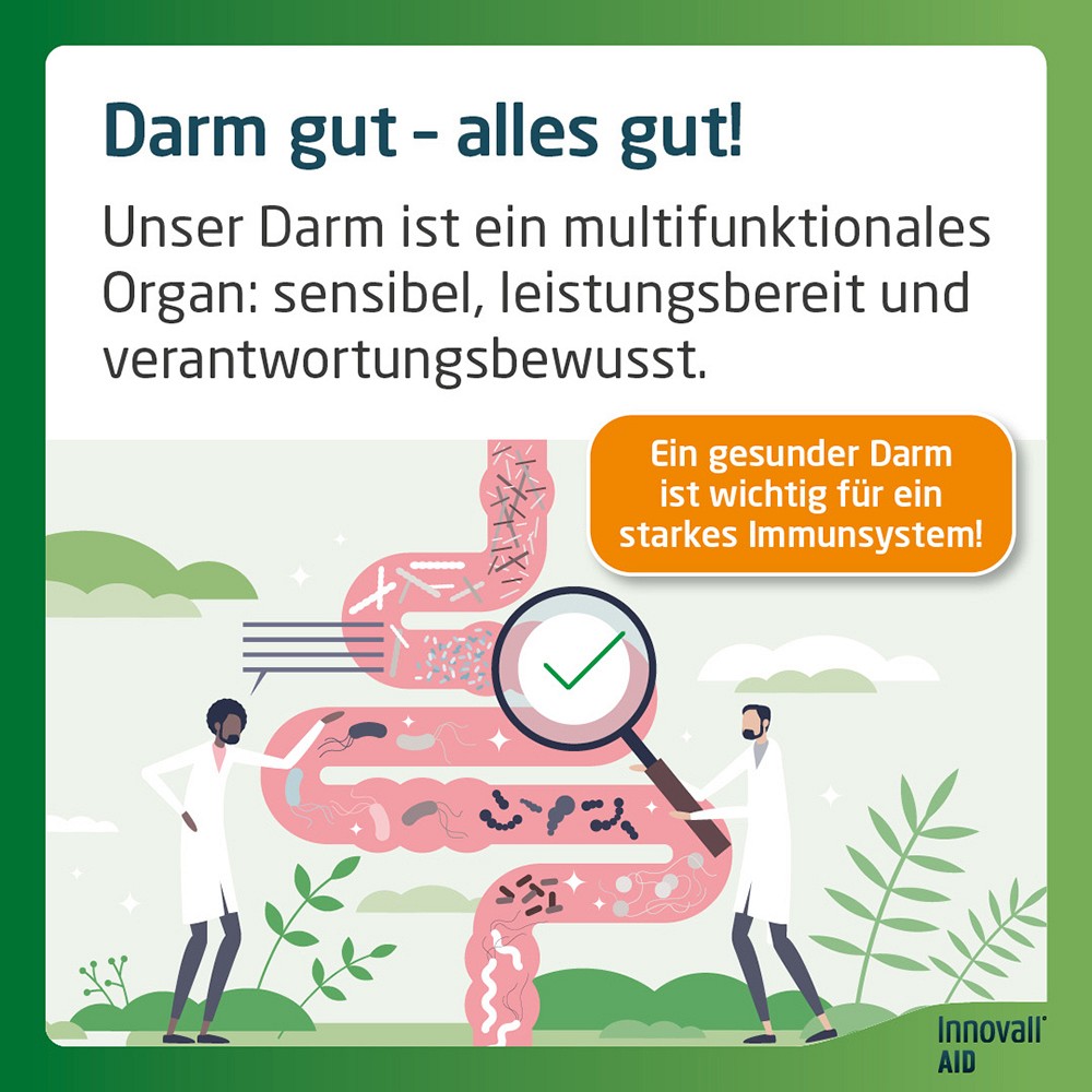 Innovall AID – Nahrungsergänzungsmittel mit 10 natürlich im menschlichen Darm vorkommenden, vermehrungsfähigen Bakterienkulturen und speziellen Nährstoffen für die Vitalität der Bakterien. Die in langjähriger Forschungsarbeit entwickelte Zusammensetzung aus 10 spezifischen Bakterienstämmen und speziellen Nährstoffen ist resistent gegen Magen- und Gallensäure.So überstehen die Darmbakterien in Innovall AID die lange Magen-Darmpassage unbeschadet bis zu ihrem Wirkort. Die Kombination von unterschiedlichen Bakterienstämmen bewirkt, dass diese sich besser im Darm ansiedeln und vermehren und das Wachstum von unerwünschten Bakterien reduzieren können.