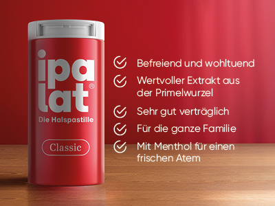 ipalat Die Halspastille gibt es seit 1937 in Apotheken. Sie ist bewährt bei Heiserkeit und Hustenreiz, rauem Hals und Halskratzen sowie strapazierter Stimme. Das in ipalat Classic enthaltene Menthol gibt zusätzlich ein Gefühl frischen und befreiten Atmens.