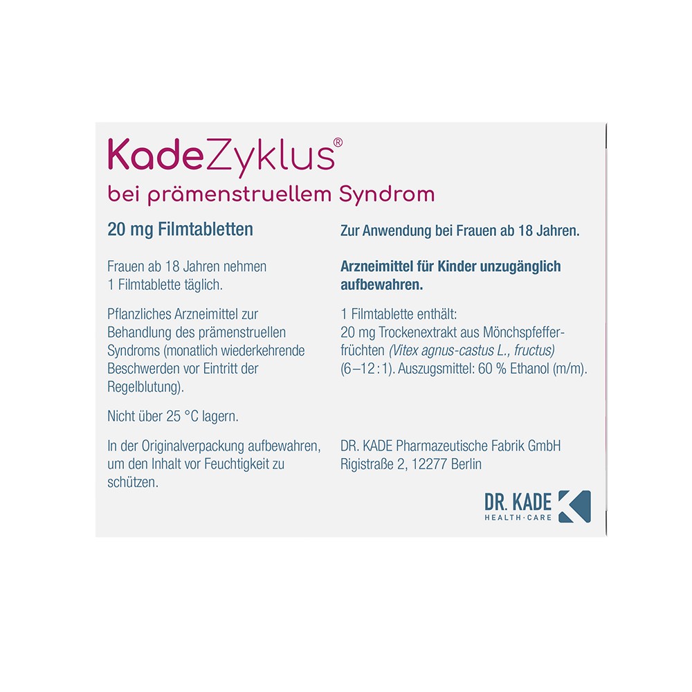 KadeZyklus bei Prämenstruellem Syndrom 20 mg richtet sich an Frauen ab 18 Jahren, die ihre PMS-Beschwerden pflanzlich behandeln möchten: wirksam, hormonfrei und gut verträglich.KadeZyklus bei prämenstruellem Syndrom 20 mg – die pflanzliche Hilfe bei PMS in optimaler Dosierung. Hol dir deine Balance zurück.