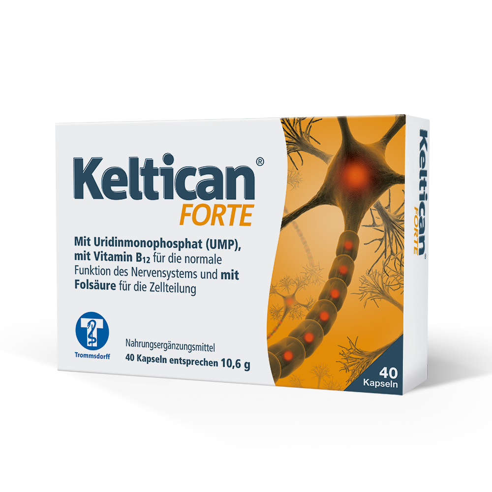 Das periphere (äußere) Nervensystem ist ein weites Netzwerk an Nerven, die Signale von und in alle Winkel des Körpers übertragen. Diese empfindlichen Nervenfasern können durch bspw. Druck, Giftstoffe oder Krankheiten geschädigt werden. Für die Nervenregeneration benötigt der Körper dann große Mengen an Nervenbausteinen.Keltican forte unterstützt die körpereigene Regeneration der peripheren Nerven mit essentiellen Nervennährstoffen. Die einzigartigen UMP-B-Pellets mit der Kombination aus den Vitaminen B12 und Folsäure* sowie zusätzlich dem wertvollen Nervenbaustein Uridinmonophosphat (UMP) optimieren die Nährstoff-Versorgung des Körpers für die Nervenregeneration.