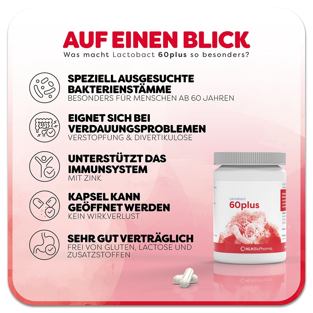 Das Probiotikum Lactobact 60plus vom Qualitätsführer HLH BioPharma enthält 5 probiotische Bakterienstämme.