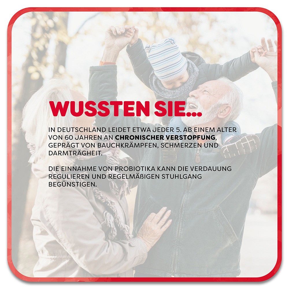 Es ist speziell auf die veränderten Bedürfnisse des Darms älterer Personen (z.B. durch Abnahme der Magensäureproduktion) entwickelt worden und trägt zur Förderung einer ausgewogenen Darmmikrobiota (Darmflora) bei.