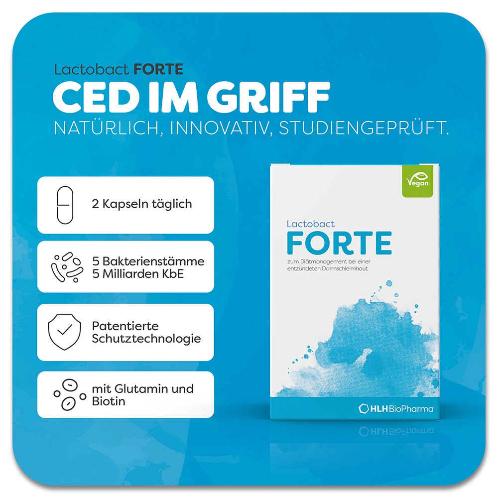 Chronisch entzündliche Darmerkrankungen (CED), wie Morbus Crohn und Colitis ulcerosa, betreffen immer mehr Menschen.Das Probiotikum Lactobact FORTE ist auf die speziellen Anforderungen des Darms betroffener Personen entwickelt worden. Die Zusammensetzung der enthaltenen Bakterienstämme ist so aufeinander abgestimmt, dass sie zum einen das Gleichgewicht der Darmmikrobiota (Darmflora) fördern und zum anderen die darmeigenen Immunzellen regulieren.
