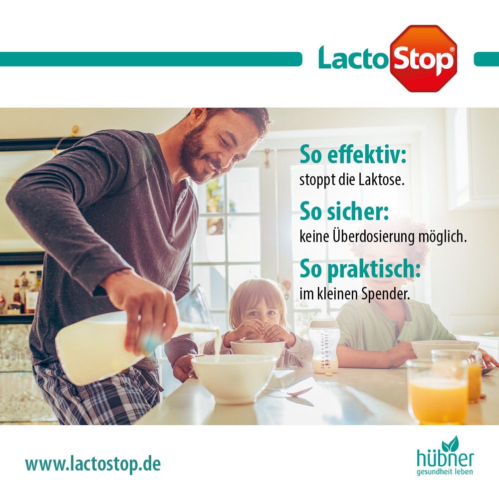 LactoStop® ersetzt das fehlende körpereigene Enzym Lactase.Lactase spaltet die mit der Nahrung aufgenommene Laktose in ihre verdaulichen Bestandteile Galactose und Glucose. Unangenehme Befindlichkeitsstörungen wie Bauchschmerzen, Völlegefühl oder Blähungen können dadurch vermieden werden.