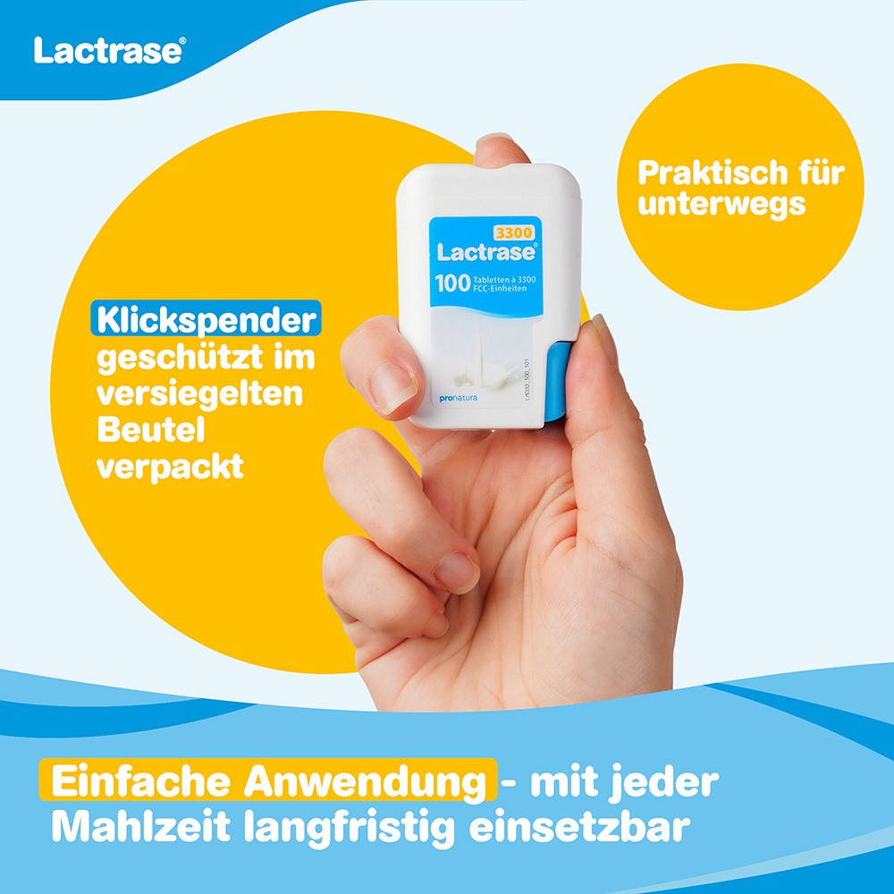 Lactrase 3300 unterstützt mit seiner millionenfach bewährten Sofortwirkung die Verdauung von Lactose (Milchzucker) und ermöglicht somit den Genuss von Milchprodukten. Das in den Tabletten enthaltene Enzym Lactase ersetzt die bei Lactoseunverträglichkeit fehlende körpereigene Lactase und spaltet die Lactose in ihre leicht verwertbaren Bestandteile Glucose und Galactose auf. So wird der Genuss von Eisbechern, Cremesuppen und Joghurts wieder möglich.