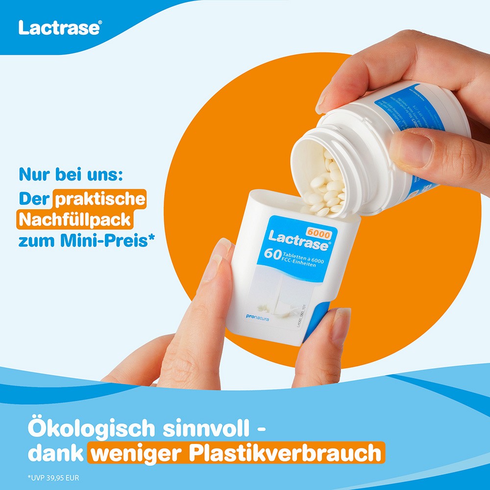 Lactrase 6000 unterstützt mit seiner millionenfach bewährten Sofortwirkung die Verdauung von Lactose (Milchzucker) und ermöglicht somit den Genuss von Milchprodukten. Das in den Tabletten enthaltene Enzym Lactase ersetzt die bei Lactoseunverträglichkeit fehlende körpereigene Lactase und spaltet die Lactose in ihre leicht verwertbaren Bestandteile Glucose und Galactose auf. So wird der Genuss von Eisbechern, Cremesuppen und Joghurts wieder möglich.