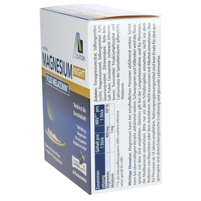 Avitale MAGNESIUM NIGHT ist ein 2-Komponenten-Präparat für erholsamen Schlaf. Der Mineralstoff Magnesium, der das Nervensystem, die normale psychische Funktion und die Muskelfunktion unterstützt, wurde sinnvoll kombiniert mit dem „Schlafhormon“ Melatonin zur Verkürzung der Einschlafzeit. Denn ausreichender und erholsamer Schlaf ist für die körperliche und mentale Regeneration enorm wichtig.