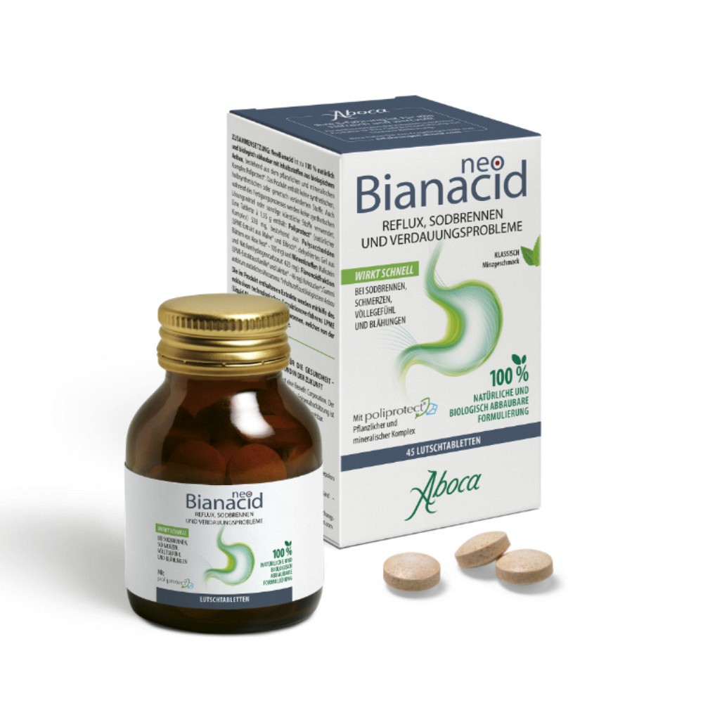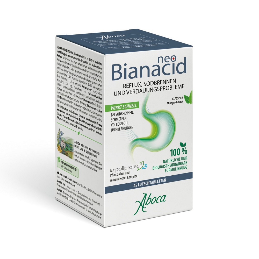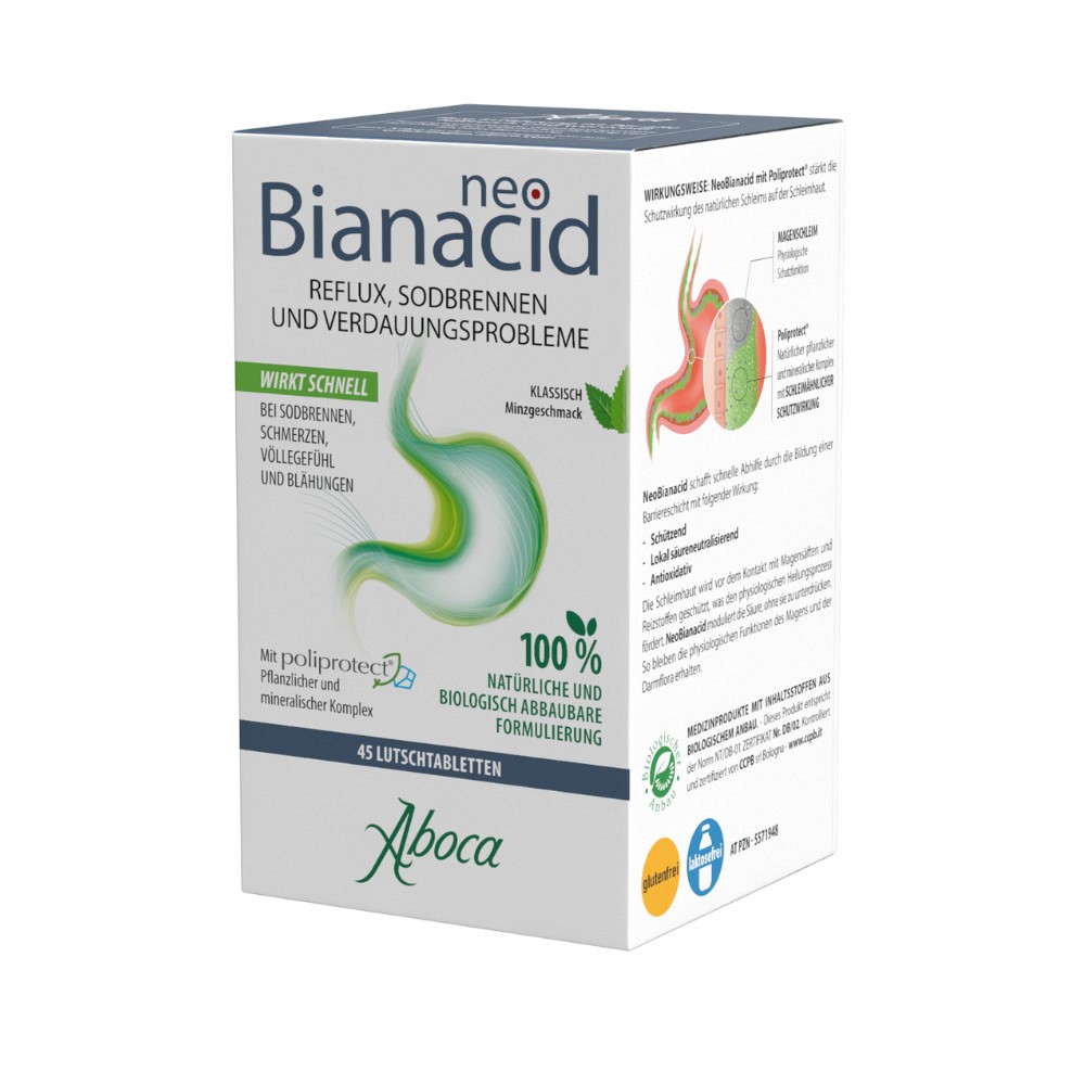 NeoBianacid Übersäuerung und Reflux ist ein Produkt auf Basis pflanzlicher und mineralischer Molekülkomplexe, das schützend und deshalb schmerzlindernd auf die Schleimhaut des Magens und der Speiseröhre wirkt und somit den typischen Symptomen gereizter und entzündeter Schleimhaut wie Sodbrennen, Schmerzen und Säuregefühl rasch entgegenwirkt.ANWENDUNGSGEBIETE