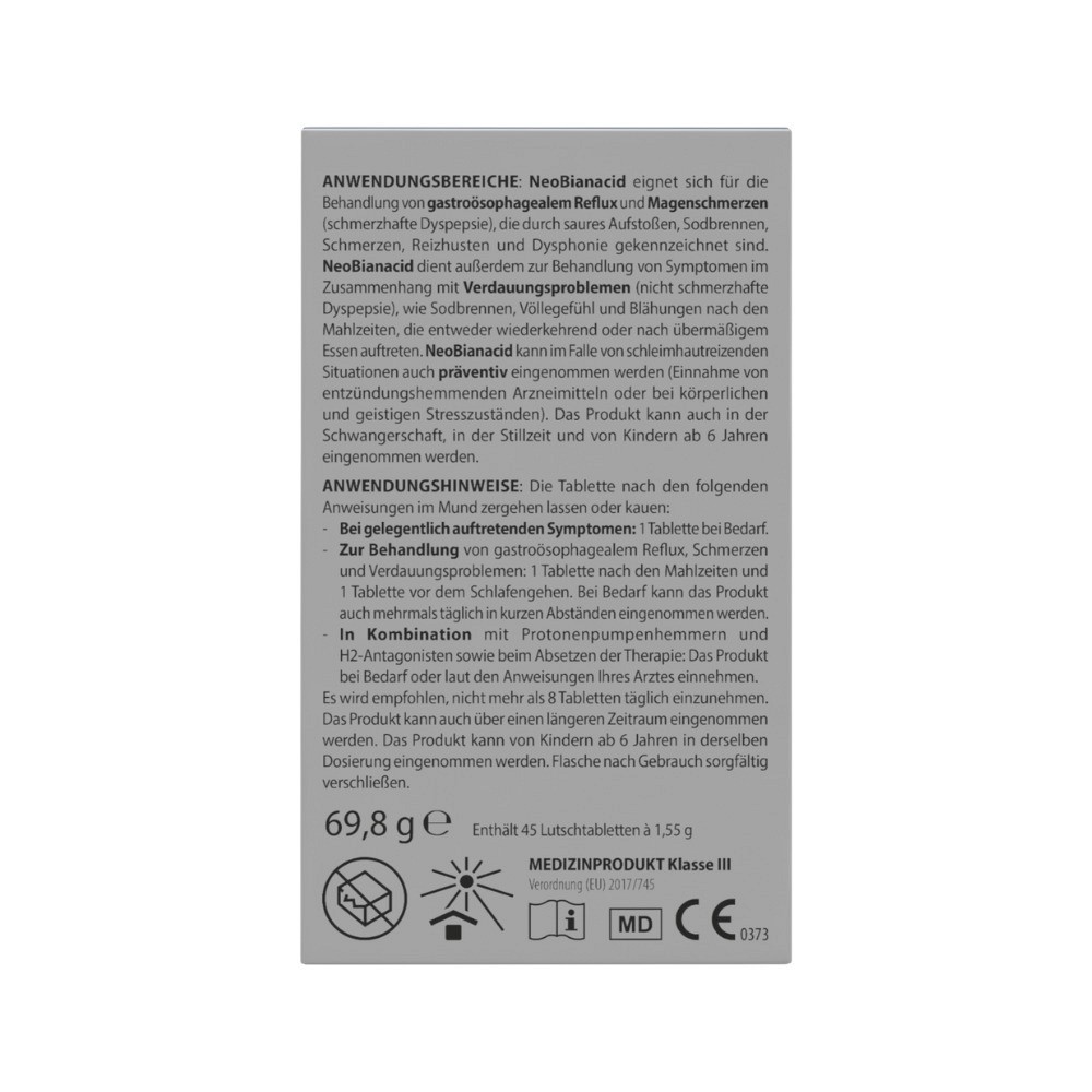 NeoBianacid Übersäuerung und Reflux ist zur Behandlung von Beschwerden geeignet, die durch Säure verursacht werden, wie Sodbrennen, Schmerzen, gastroösophagealem Reflux und Gastritis.Des Weiteren ist es zur Behandlung von Symptomen geeignet, die mit Dyspepsie (Verdauungsstörungen) einhergehen, wie Sodbrennen, Völlegefühl und Blähungen.