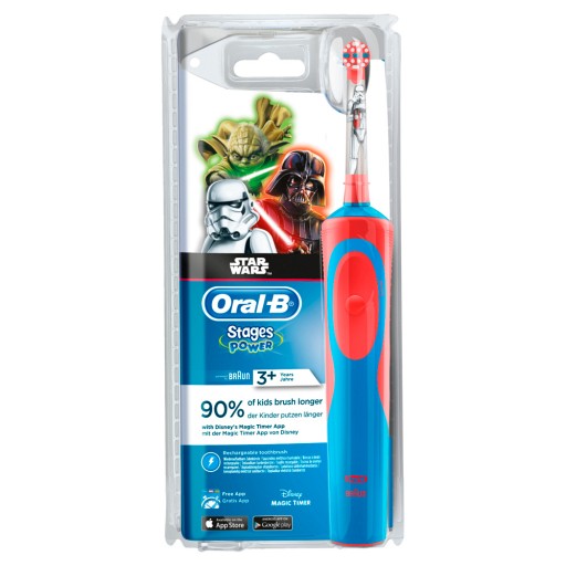 Die Oral-B Kids elektrische Zahnbürste für Mädchen und Jungen, mit Figuren aus Disneys Star Wars –. legt die Power in die Hände Ihres angehenden Superhelden. Diese wiederaufladbare elektrische Zahnbürste verfügt über extra weiche Borsten, die speziell für Kinder entwickelt wurden, und kann mit der Disney Magic Timer App von Oral-B verwendet werden.Laden Sie die App herunter und helfen Sie Ihren Kindern so, die von Zahnärzten empfohlene Putzzeit von 2 Minuten einzuhalten und sich spielerisch an eine Mundpflege zu gewöhnen, die ihnen ein Leben lang zugutekommt.