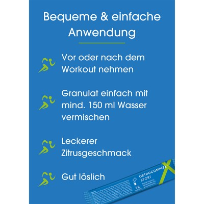 Täglich den Inhalt eines Beutels in mindestens 150 ml Wasser auflösen. Bevorzugt vor oder nach dem Sport einnehmen.Die Marke ORTHOCOMPLEX®