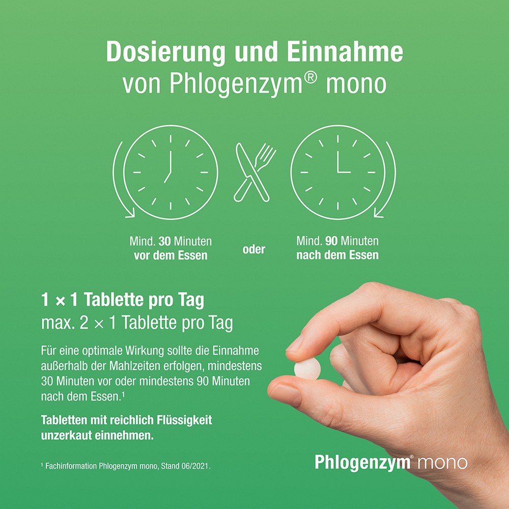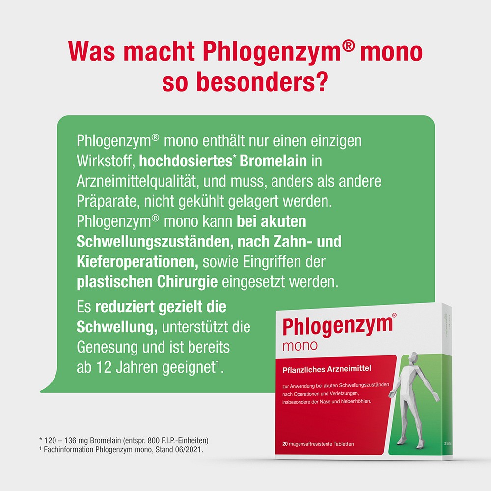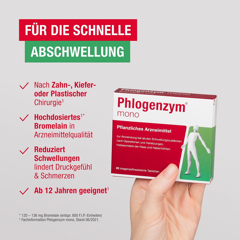 Phlogenzym mono ist ein pflanzliches Arzneimittel für Erwachsene und Jugendliche ab 12 Jahren, welches zur unterstützenden Behandlung bei Schwellungen nach Operationen oder Verletzungen (insbesondere für Nasen und Nasennebenhöhlen) angewendet wird.