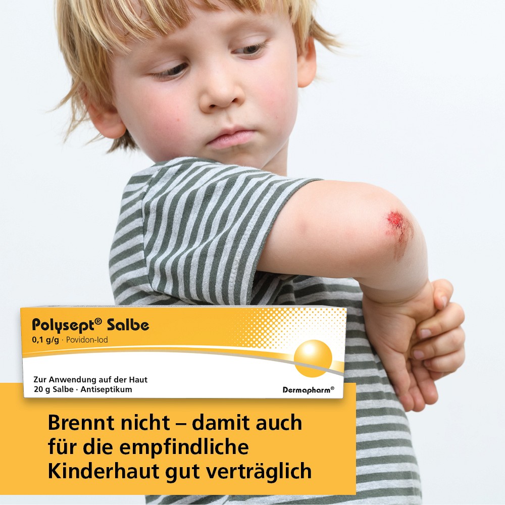 Anwendungsgebiete: Salbe: Zur wiederholten, zeitlich begrenzten oberflächlichen Anwendung als Antiseptikum bei geschädigter Haut, wie z.B. Decubitus, Ulcus cruris, oberflächlichen Wunden und Verbrennungen, infizierten und superinfizierten Dermatosen. Lösung zusätzlich: Zur einmaligen Anwendung als Antiseptikum auf der intakten äußeren Haut oder Schleimhaut wie z.B. vor Operationen, Biopsien, Injektionen, Punktionen, Blutentnahmen und Blasenkatheterisierungen. Polysept Lösung/Salbe wird angewendet bei Erwachsenen, Jugendlichen und Kindern ab einem Jahr.