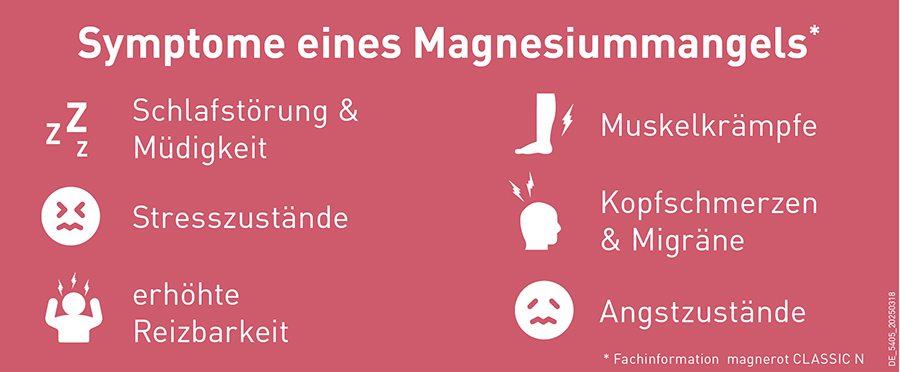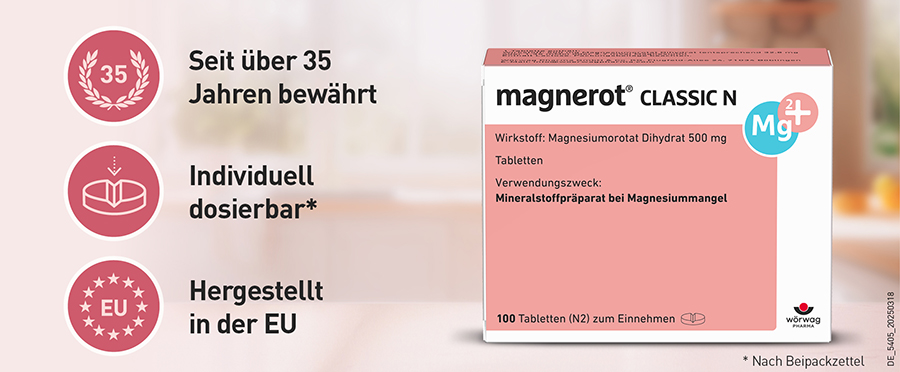 Nicht jede Magnesiumverbindung ist gleich – die Bioverfügbarkeit spielt eine entscheidende Rolle. magnerot CLASSIC N enthält Magnesiumorotat, eine Kombination aus Magnesium und der körpereigenen Orotsäure. Diese Verbindung sorgt für eine effiziente Aufnahme von Magnesium im Körper.Welche Anzeichen hat ein Magnesiummangel?