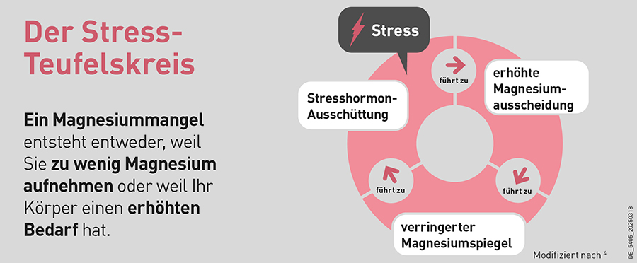 In den vergangenen Jahren hat Stress signifikant zugenommen. Mittlerweile fühlen sich mehr als ein Viertel der Bundesbürger häufig gestresst, so das Ergebnis einer aktuellen Stressstudie der Techniker Krankenkasse.2 Ein Magnesiummangel entsteht entweder, weil zu wenig Magnesium aufgenommen wird oder weil der Körper einen erhöhten Bedarf hat.In stressigen Phasen benötigt der Körper mehr Magnesium, doch häufig wird in dieser Zeit vermehrt auf Fast Food und Fertiggerichte zurückgegriffen, die eher weniger Magnesium enthalten. Ein Mangel kann die Produktion von Stresshormonen zusätzlich anregen, wodurch sich der Stress verstärken kann und der Magnesiumhaushalt belastet wird.