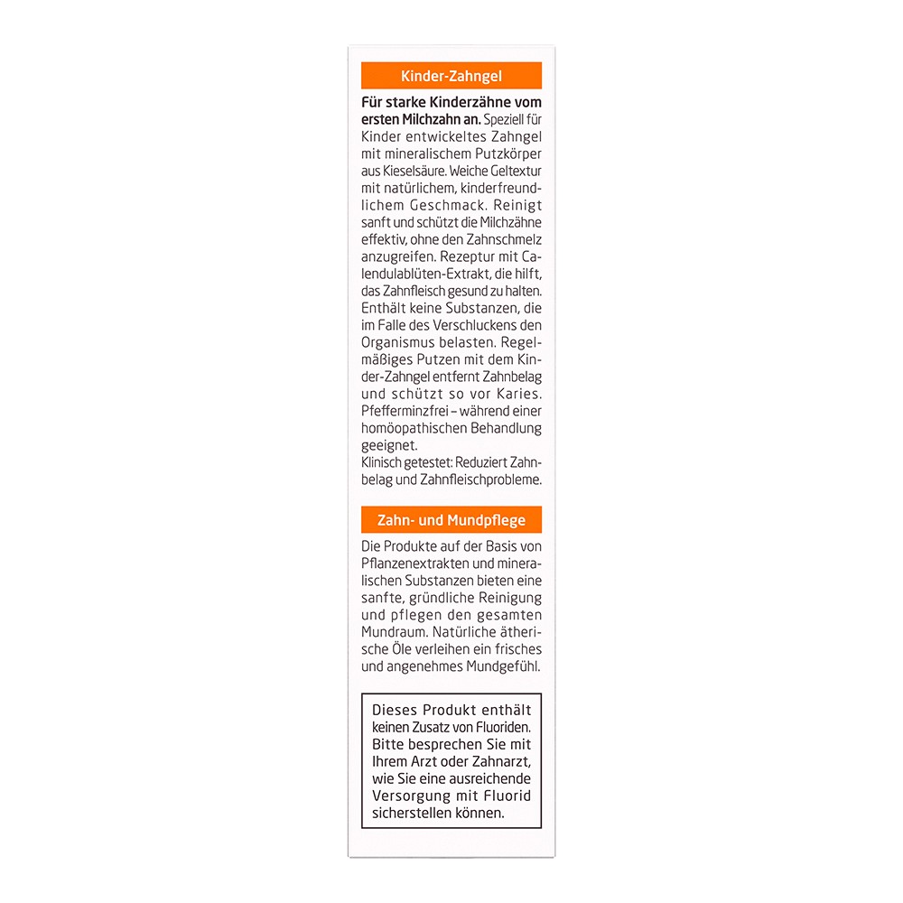 Die milde Gesamtkomposition enthält keine Substanzen, die den Organismus belasten, wenn das Gel geschluckt wird. Die pflanzlichen Auszüge des Zahngels und der bewährte Kieselsäure-Putzkörper entfernen Zahnbelag und schützen so zuverlässig vor Karies.