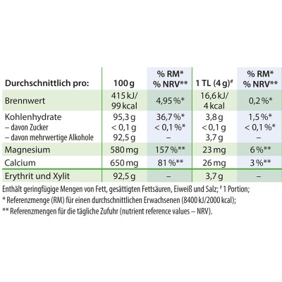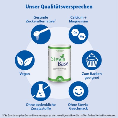 SteviaBase liefert einen relevanten Gesundheitsbeitrag zum Tagesbedarf an Magnesium (ab 2 ½ TL) und Calcium (ab 5 TL).*Die Inhaltsstoffe in SteviaBase unterstützen: