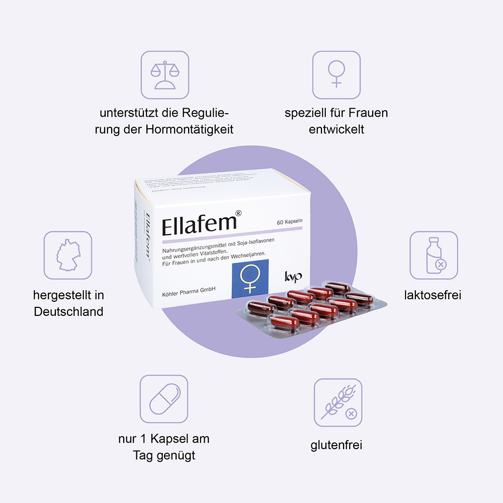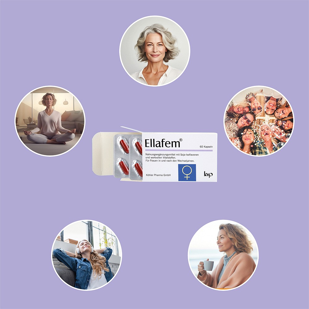 Beim Ausgleich der körperlichen Bedürfnisse während der Wechseljahre bietet ELLAFEM® als gezielte Nahrungsergänzung mit Phytoöstrogenen in Verbindung mit 15 zusätzlichen Vitalstoffen auf sanfte Weise Unterstützung. Denn das einzigartige Zutatenprofil von ELLAFEM® wird den speziellen Ernährungsbedürfnissen von Frauen in und nach den Wechseljahren gerecht.