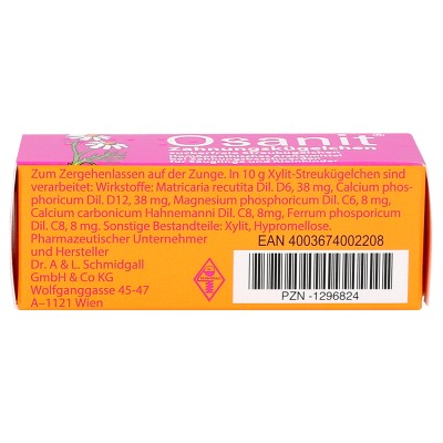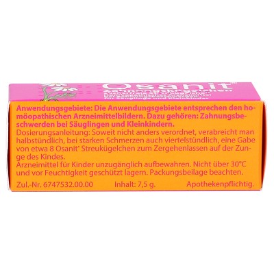 Anwendungsgebiete: Osanit Streukügelchen sind ein homöopathisches Arzneimittel, zuckerfrei. Die Anwendungsgebiete entsprechen den homöopathischen Arzneimittelbildern. Dazu gehören: Zahnungsbeschwerden bei Säuglingen und Kleinkindern.