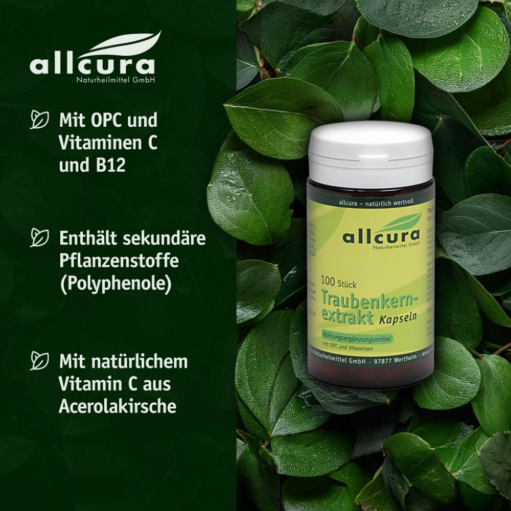 • 600 mg Traubenkernextrakt (= 180 mg OPC),