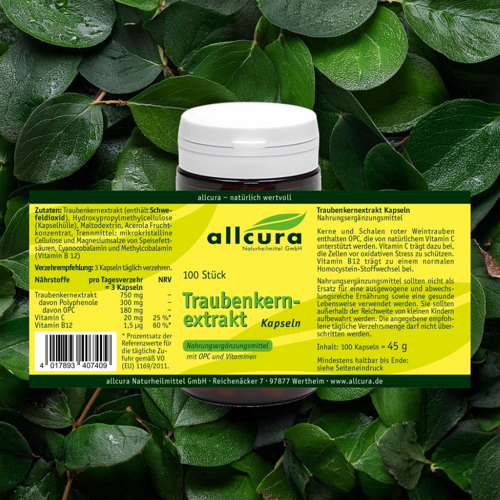 Zutaten: Traubenkernextrakt (200 mg pro Kapsel = 60 mg Polyphenole), Maltodextrin, Hydroxypropylmethylcellulose (Kapselhülle), Acerola Fruchtkonzentrat (40 mg), Vitamin B12 (Cyanocobalamin), Trennmittel Magnesiumsalze der Speisefettsäuren.