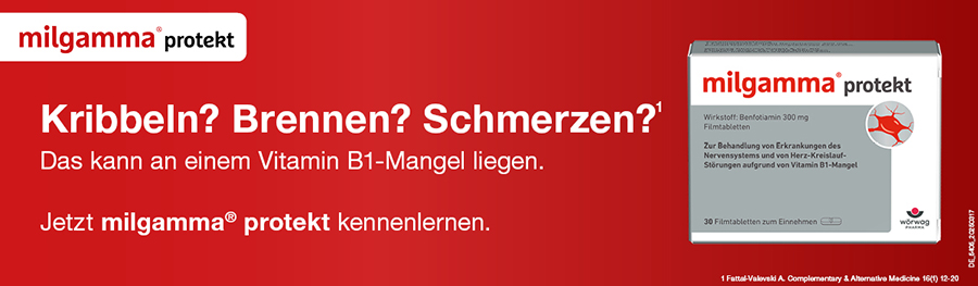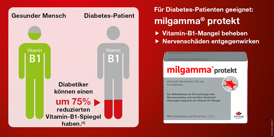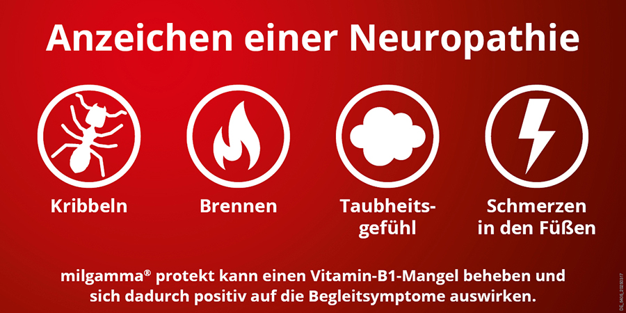 Da der erhöhte Bedarf an Vitamin B1 oft nicht allein durch die normale Ernährung gedeckt werden kann, ist es besonders wichtig, den Körper ausreichend mit Vitamin B1 zu versorgen.Der in milgamma protekt enthaltene Wirkstoff Benfotiamin behebt den Vitamin-B1-Mangel als eine Ursache von Nervenschädigungen und kann so bei regelmäßiger Einnahme die Begleitsymptome einer auf einem Vitamin-B1-Mangel beruhenden Neuropathie wie Kribbeln, Brennen, Taubheitsgefühle und Schmerzen in den Füßen lindern.