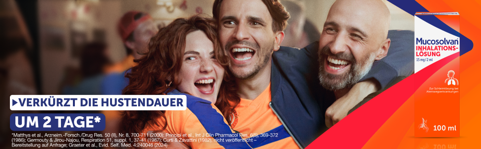 Die Mucosolvan Inhalationslösung verkürzt die Hustendauer um 2 Tage* und sorgt für schnelle Hustenlinderung. Sie löst den Schleim, erleichtert das Abhusten und befreit die Bronchien. Sie kann mit allen modernen Inhalationsgeräten, z.B. Kompressor- oder Ultraschallverneblern, angewendet werden.Durch die Inhalation gelangt der Wirkstoff direkt in die Bronchien und hilft so bei Atemwegserkrankungen mit zähem Schleim. Geeignet für Erwachsene und für Kinder ab 6 Jahren.