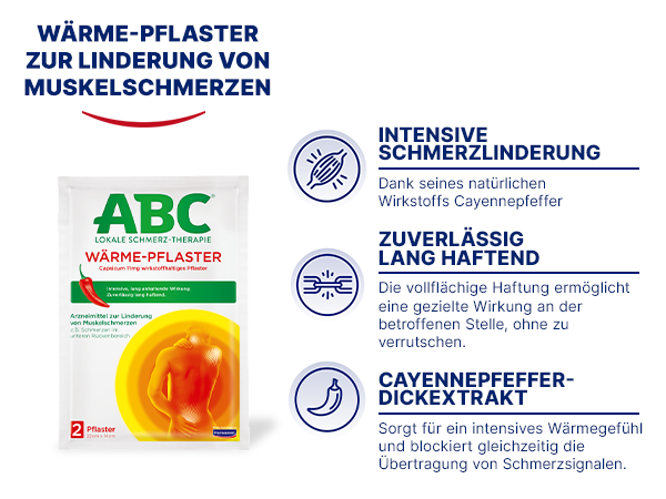 Das ABC Lokale Schmerz-Therapie Wärme-Pflaster Capsicum lindert schmerzhafte Muskelschmerzen, z. B. Schmerzen im unteren Rückenbereich. Das natürliche Capsaicin aus der Chilischote regt die Durchblutung an, die Wärme breitet sich über die gesamte Pflasterfläche aus und wirkt effektiv und lang anhaltend gegen den Schmerz.Die zuverlässige, vollflächige Haftung des Pflasters ermöglicht eine gezielte Wirkung genau an der betroffenen Stelle, ohne zu verrutschen. Es ist einfach und praktisch in der Anwendung, dünn über die gesamte Fläche und trägt unter der Kleidung nicht auf.