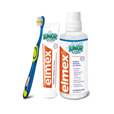 Zahnärzte empfehlen, die Zähne mindestens 2x täglich jeweils nach den Mahlzeiten zu putzen, um eine gute Mundhygiene zu erreichen. Wenn Sie eine fluoridhaltige Zahnpasta wie elmex JUNIOR verwenden, profitieren die Zähne von wirksamem Kariesschutz.Zusätzlich wird empfohlen, 1x wöchentlich elmex gelée und täglich eine Zahnspülung zu verwenden. Die kombinierte Anwendung senkt das Kariesrisiko signifikant im Vergleich zum täglichen Zähneputzen allein.