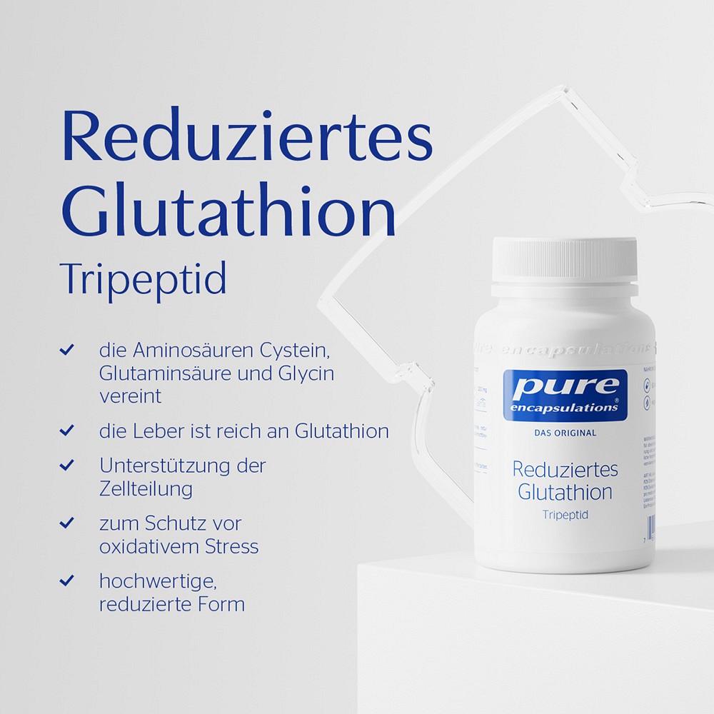 Reduziertes Glutathion in geprüfter QualitätGlutathion ist ein Tripeptid, gebildet aus den Aminosäuren L-Cystein, L-Glutaminsäure und L-Glycin und ist eine wichtige Säule des menschlichen Atioxidanzien-Systems. Als zusätzlicher Bestandteil zu deiner ausgewogenen Ernährung kann Pure Encapsulations® Reduziertes Glutathion zu einer nachhaltigen Versorgung beitragen. Das Produkt ist vegan und ohne unnötige Zusatzstoffe.
