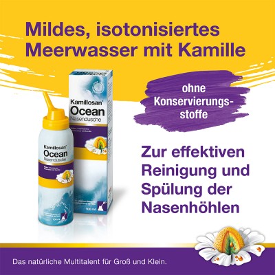 • LIEFERUMFANG: 1 Packung enthält 100 ml Nasenspülsalz-Lösung. Die Anwendung von Kamillosan Ocean Nasendusche ist für eine Dauer von mehreren Wochen geeignet