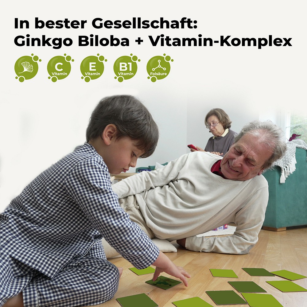 Nahrungsergänzungsmittel mit 100 mg Ginkgo Biloba Trockenextrakt und den Vitaminen C, E, B1 und Folsäure.