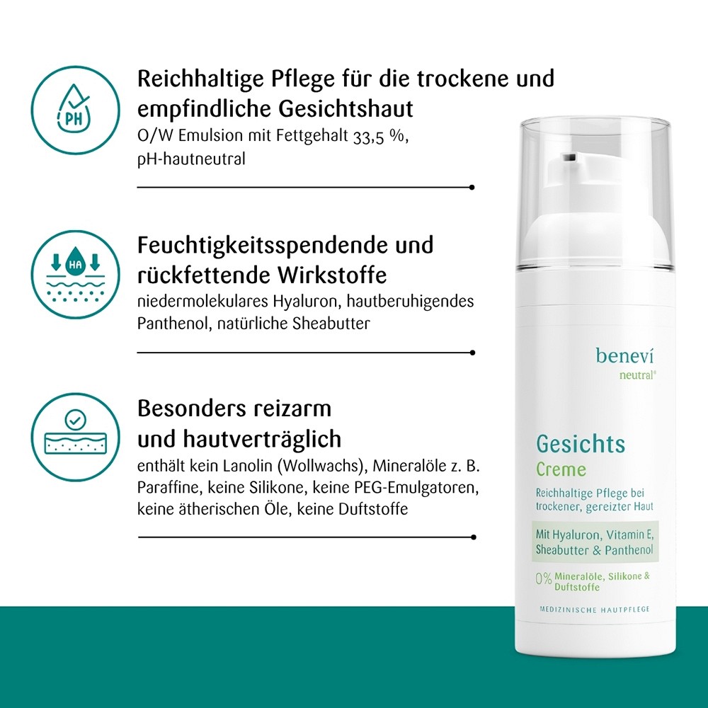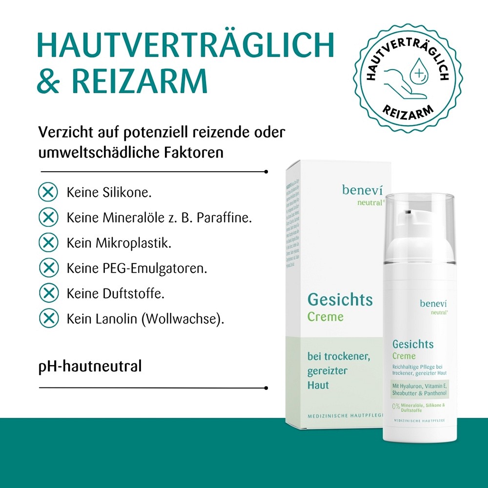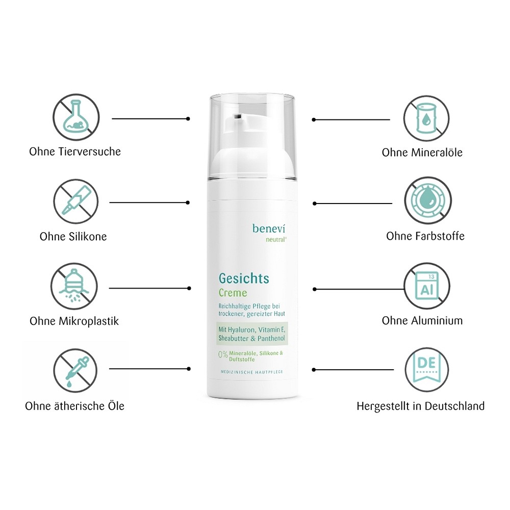 Wie alle benevi neutral-Produkte verzichtet auch die Gesichts-Creme auf belastende Zusätze wie Duft- und Farbstoffe, PEG-Emulgatoren, Mineralöle und Silikone.