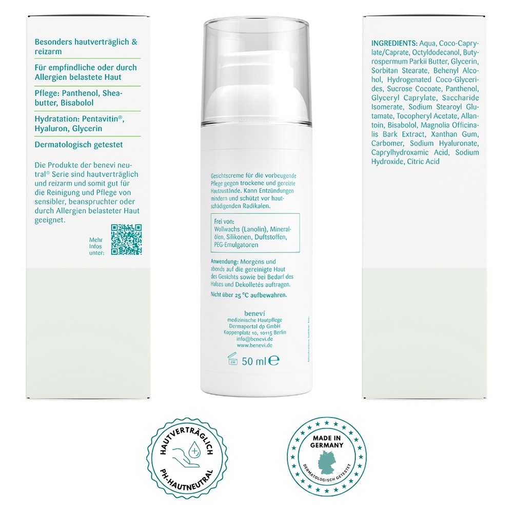 Die benevi neutral Gesichts-Creme stärkt mit einem hohen Lipidanteil die Hautbarriere und beugt damit Hautreizungen vor. Sheabutter sorgt für eine ausreichende Rückfettung nach der Hautreinigung. Panthenol und Hyaluronsäure lindern Hautreizungen und versorgen die Haut mit Feuchtigkeit.