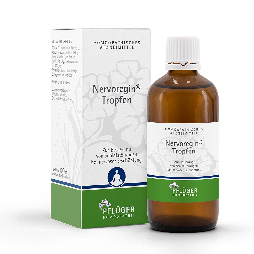 Nervoregin® Tropfen enthalten eine einzigartige Kombination homöopathisch potenzierter Einzelmittel, deren beruhigende und schlaffördernde Wirkung seit langem geschätzt wird: Hafer (Avena sativa) ist in der Homöopathie das Mittel der ersten Wahl bei Erschöpfung und Schlafstörungen, Passionsblume (Passiflora incarnata) beruhigt bei Unruhezuständen und fördert einen gesunden Schlaf, echter Hopfen (Humulus lupulus) ist ein bewährtes Arzneimittel bei Schlafstörungen und Phosphorsäure (Acidum phosphoricum) hilft bei geistiger und körperlicher Erschöpfung. Das homöopathische Komplexmittel unterstützt das vegetative Nervensystem und hilft, zur Ruhe zu kommen.