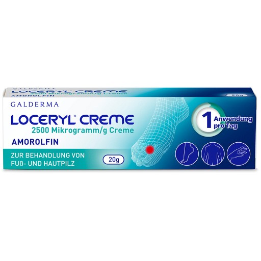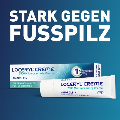 Fußpilz ist eine weitverbreitete Krankheitserscheinung der Haut, die häufig durch unangenehmes Jucken und Brennen begleitet wird. Die Loceryl Creme ist ein Arzneimittel gegen Fußpilz mit dem Wirkstoff Amorolfin. Der Wirkstoff dringt in die betroffene Fußhaut ein und entfaltet dort seine pilzabtötende Wirkung. Die Creme ist gut verträglich, zieht schnell ein und fettet nicht. Und das Beste: Loceryl Creme gegen Fußpilz ist angenehm in der Anwendung – einfach einmal täglich auftragen.Vorteile von Loceryl Creme gegen Fußpilz