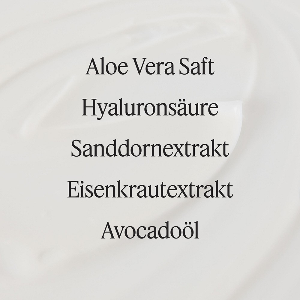 Die ausgewogene Gesichtscreme wirkt regenerierend und versorgt die Haut mit schützender Pflege. Reiner Aloe Vera Saft und Hyaluron spenden und binden intensiv Feuchtigkeit. Sanddorn- und Eisenkrautextrakt fördern die Hautregeneration und wirken reparierend.