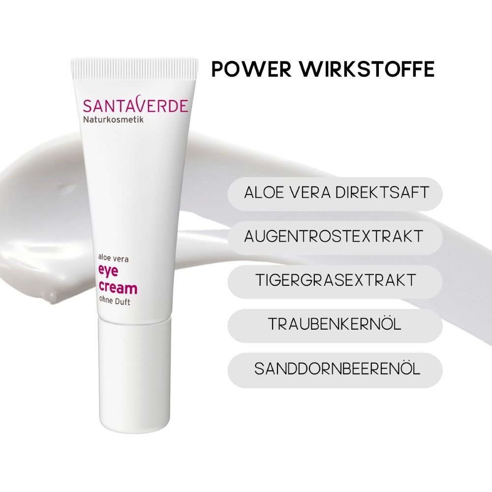 Die sanfte Augencreme pflegt die empfindliche Augenpartie mit reizlindernden und schützenden Wirkstoffen. Reiner Aloe Vera Saft versorgt die Haut intensiv und nachhaltig mit Feuchtigkeit. Beruhigende Extrakte aus Augentrost und Tigergras wirken abschwellend und lindern Reizungen und Irritationen.