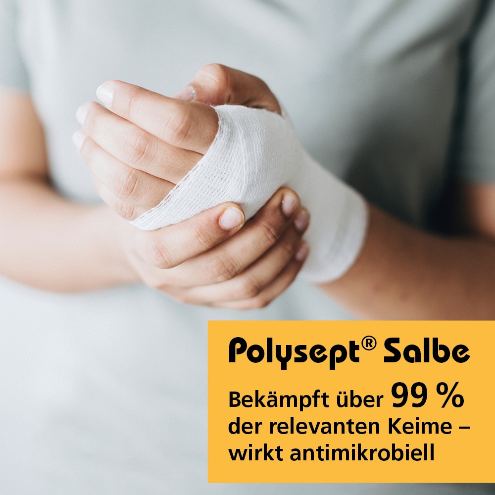 Anwendungsgebiete: Salbe: Zur wiederholten, zeitlich begrenzten oberflächlichen Anwendung als Antiseptikum bei geschädigter Haut, wie z.B. Decubitus, Ulcus cruris, oberflächlichen Wunden und Verbrennungen, infizierten und superinfizierten Dermatosen. Lösung zusätzlich: Zur einmaligen Anwendung als Antiseptikum auf der intakten äußeren Haut oder Schleimhaut wie z.B. vor Operationen, Biopsien, Injektionen, Punktionen, Blutentnahmen und Blasenkatheterisierungen. Polysept Lösung/Salbe wird angewendet bei Erwachsenen, Jugendlichen und Kindern ab einem Jahr.