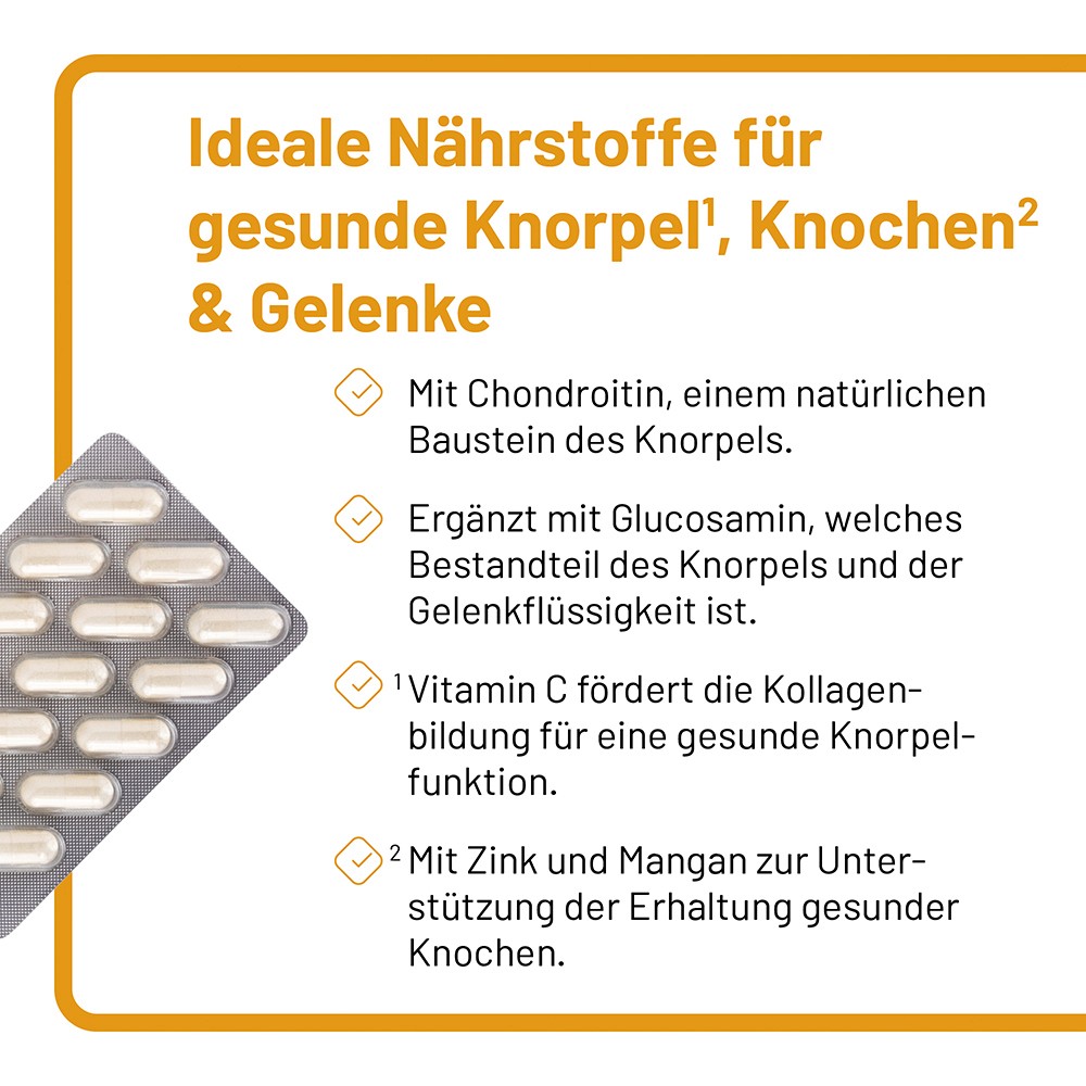 Chondroitinsulfat ist ein Mukopolysaccharid und wichtiger Bestandteil des Knorpelgewebes. Vitamin C trägt zur normalen Kollagenbildung, für eine normale Funktion der Knochen und für eine normale Knorpelfunktion bei. Knorpel ist ein glattes Gewebe, das Gelenke und Skelettstellen überzieht. Der Knorpel hat dabei die Funktion eines schützenden Polsters.